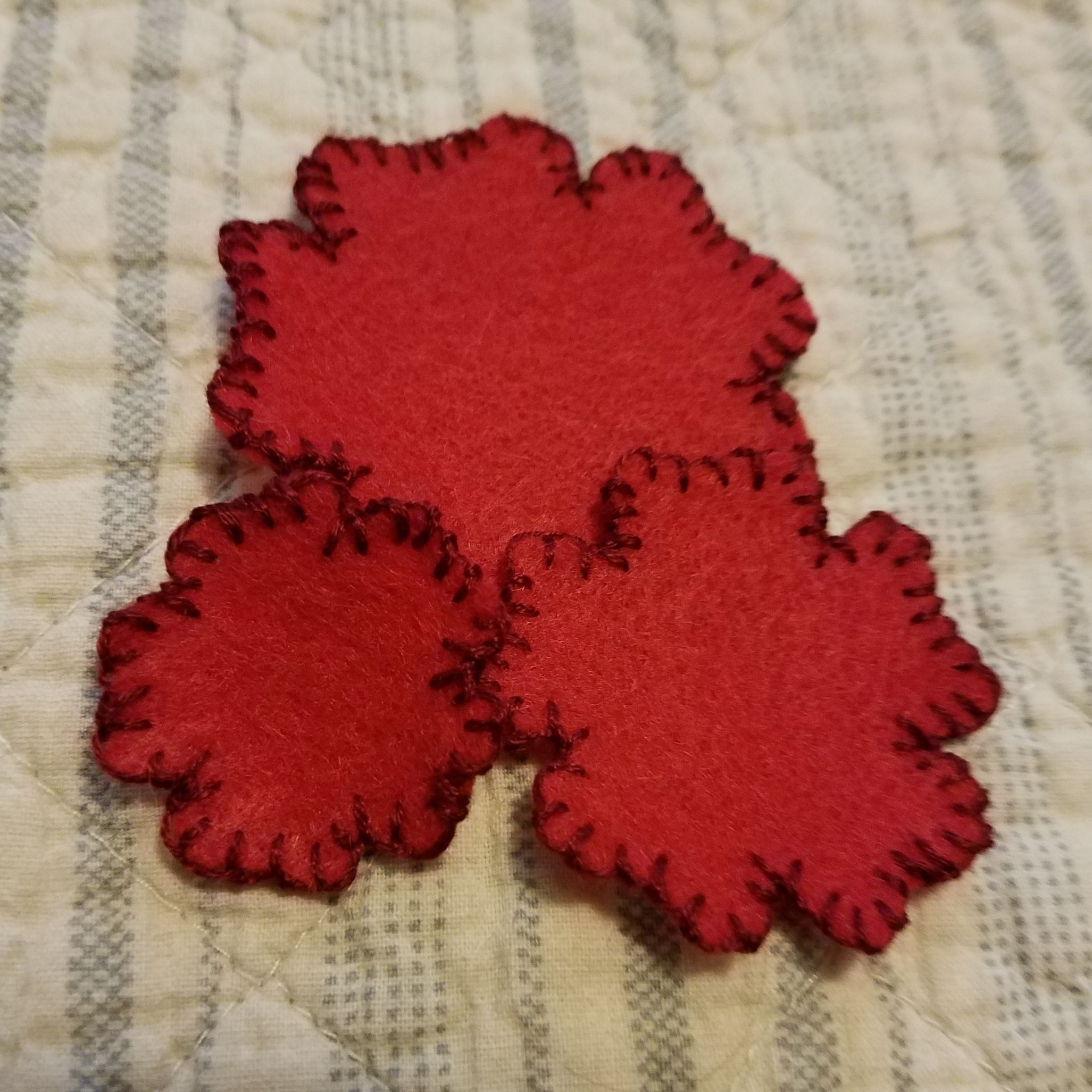 Hand sew a blanket stitch, with the embroidery thread, around the edges of each of the flowers. Leave the circle without a blanket stitch; it will be used to fasten the pin on the back.![]()