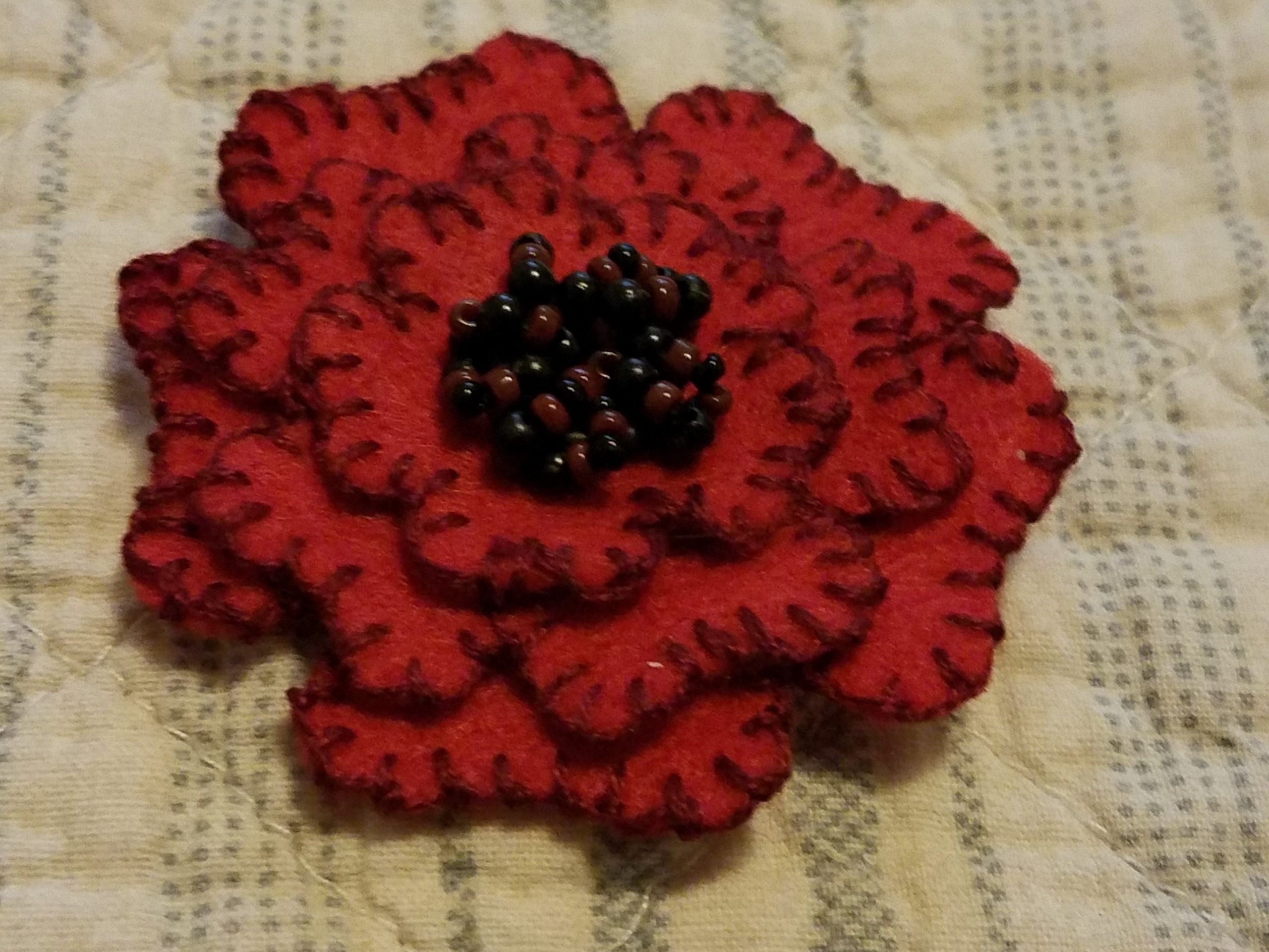 Once you finish the blanket stitch edge on the petals, assemble your felt poppy. Place a black button in the center of the smaller layer; next add the middle size, and then the larger. Using the black thread, attach all of these layers together through the button holes, stringing seed beads on the thread, threading over the button, and through to the back. Repeat, adding as many beads to your liking and then tie off.